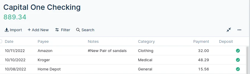 I didn't like those sandals as much as I thought I did. They made my feet look big. So I decided to return them a few days later. To enter the return, I fill out a nearly identical transaction in the account that will be credited. In my case, I had Amazon put the money back on my Debit card. Instead of putting the return amount in the payment column, I've entered the amount in the Deposit column. I also made sure that I chose Clothing as my category.