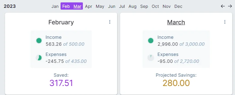 When a new month begins, your Projected Savings changes to Saved or Overspent, depending on your final transactions. The final savings amount calculated for this field is your actual income minus your actual expenses. If you hover your mouse over the Saved or Overspent text, you can view the breakdown of projected and actual savings for the month.