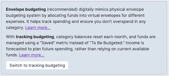 The Tracking budget option allows the user to shift from the default Envelope budget option to a more traditional style of budgeting. The Tracking budget won't automatically rollover funds from month to month, and you don't have to account for all on budget funds continually. Instead of working with what funds you have now, you can forecast expenses and income. All transactions do still need to be categorized.